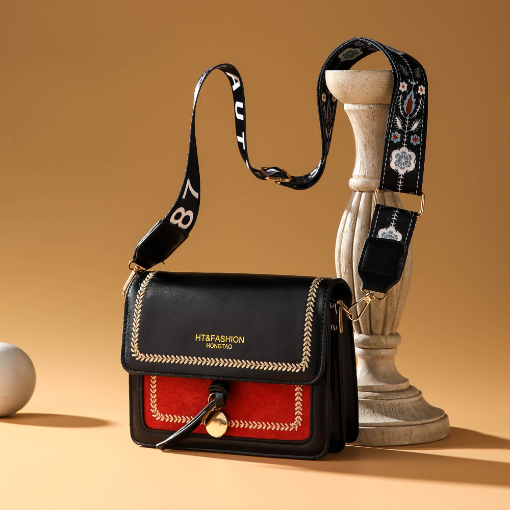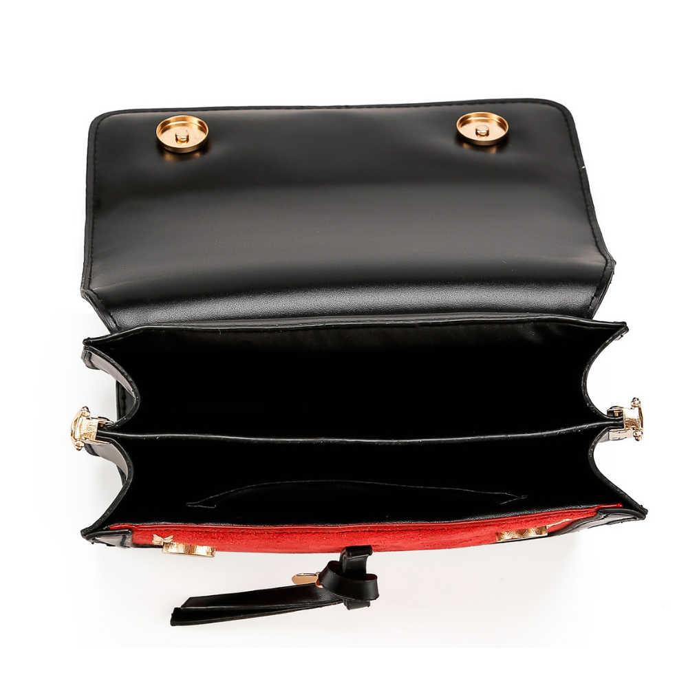 Make a bold entrance with the Bohemian Edge bag from Diva Dale — a stunning fusion of edgy style and intricate craftsmanship. Crafted in sleek black faux leather, this bag features a vibrant red suede-textured front panel, creating a striking color contrast that turns heads.