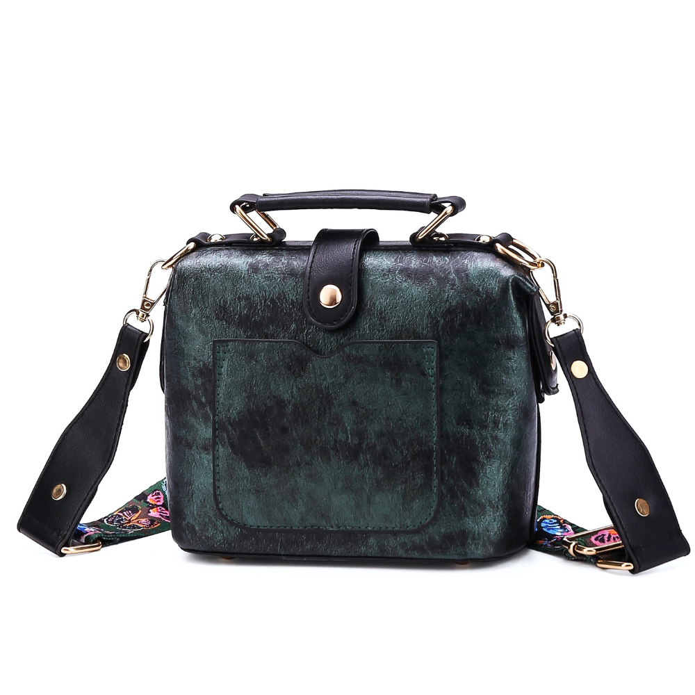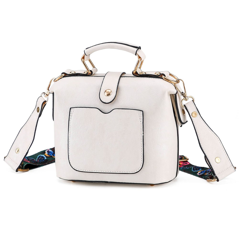 Crafted from durable, faux leather in a structured silhouette, this sling bag holds its form while keeping your essentials organized and secure. A whimsical wide strap (featuring motifs like butterflies or folk patterns) brings a free-spirited, bohemian twist, whether you wear it crossbody, over the shoulder, or carry it by the sleek top handle (white version).