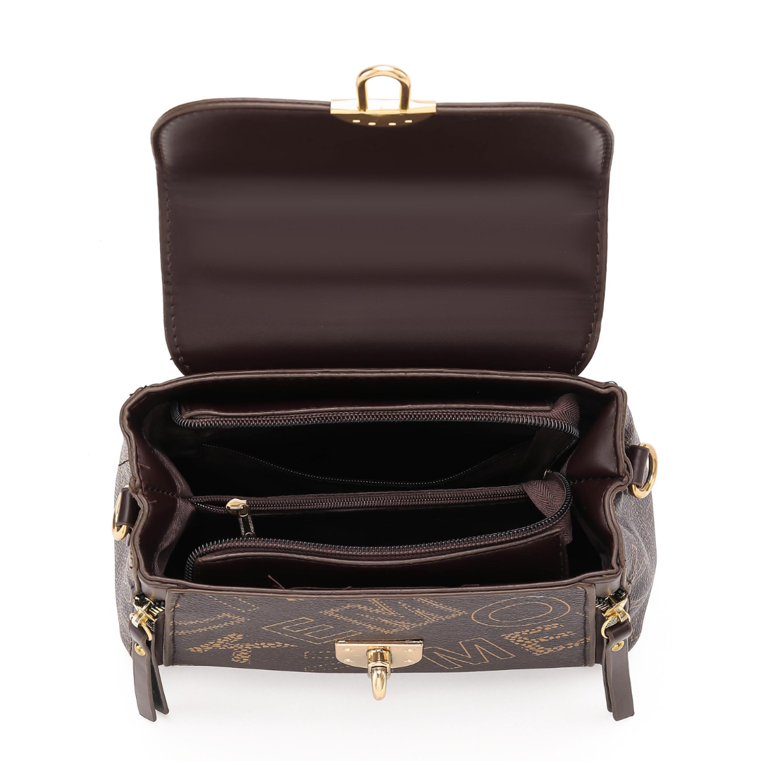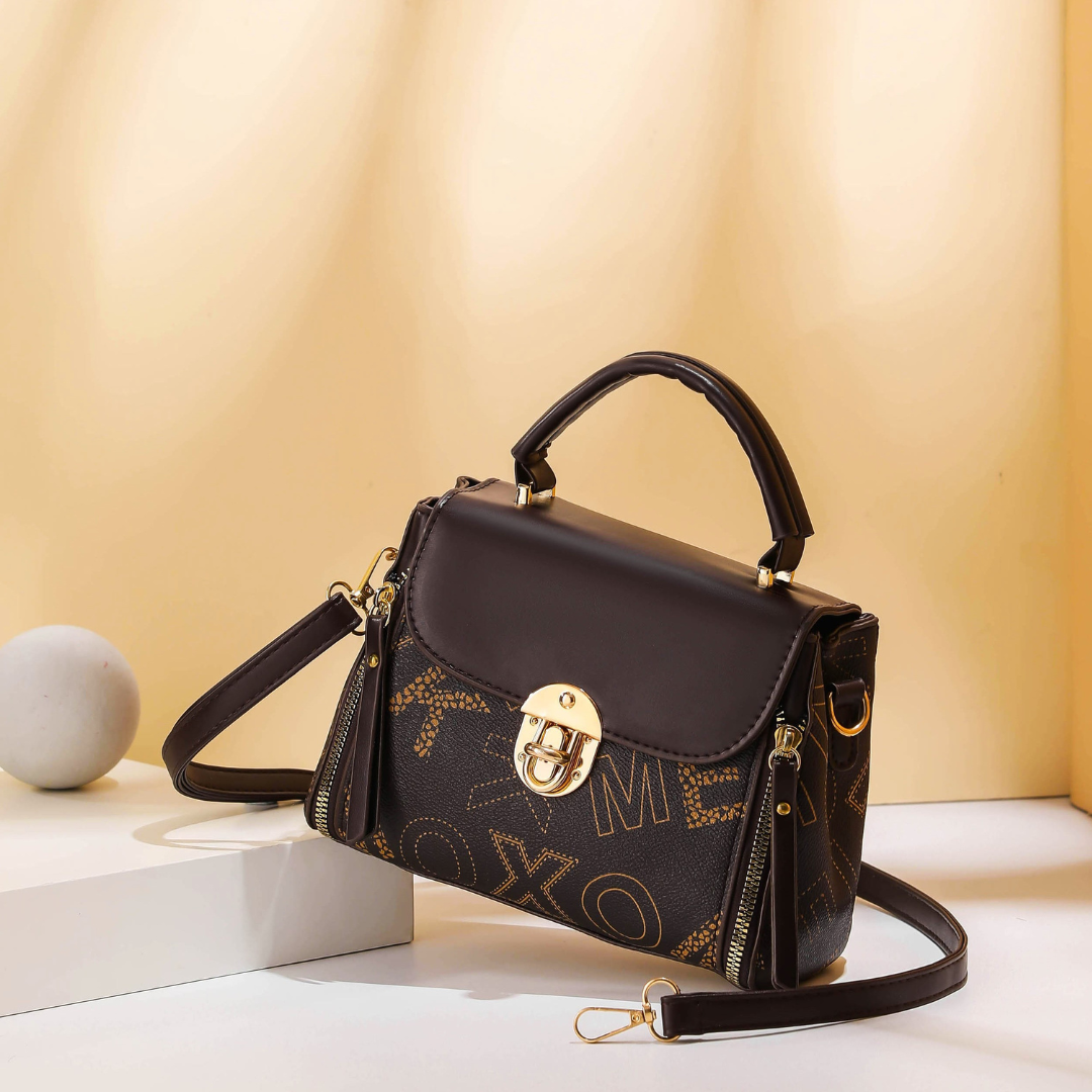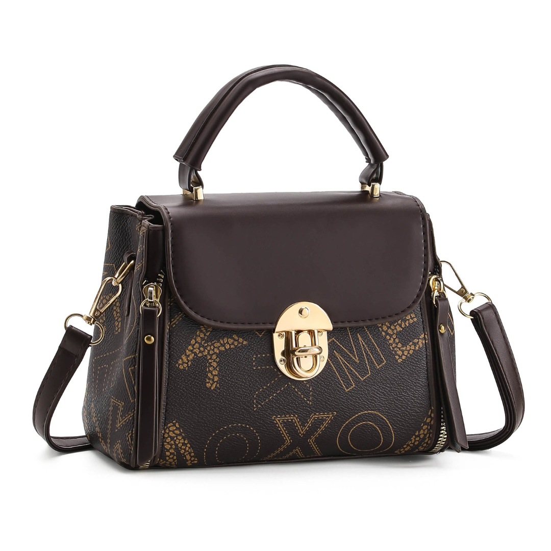 Elevate your everyday style with the Choco Charm Luxe Satchel—a perfect blend of sophistication and practicality. Crafted from rich brown faux leather, this structured handbag features bold stitched XO patterns that bring texture and personality to your look. The polished gold turn-lock closure adds a luxe touch while keeping your essentials secure.