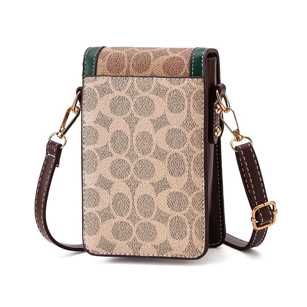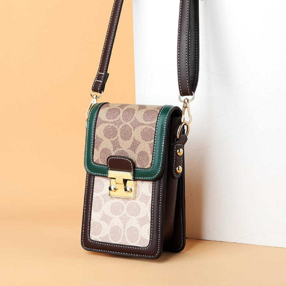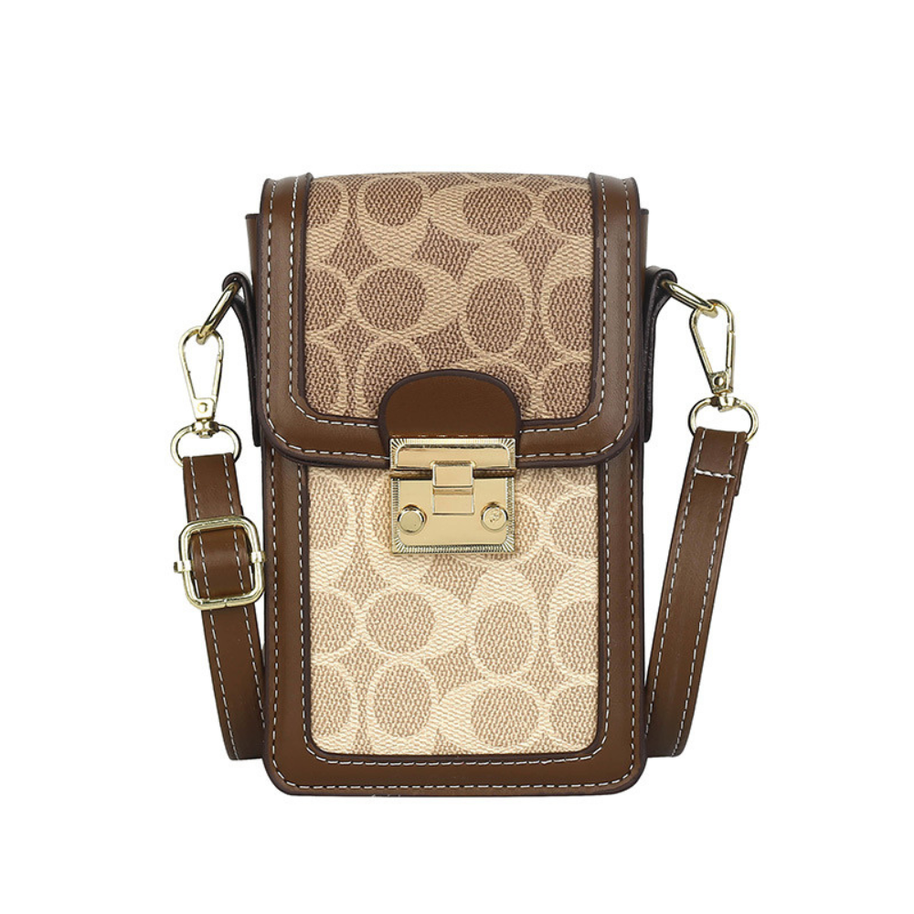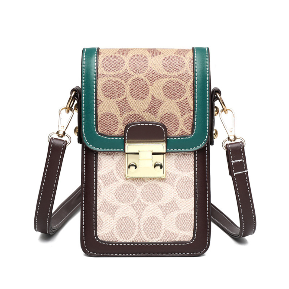 Chic, compact, and designed for life on the go — the Diva Dale Patterned Textured Crossbody Phone Bag is the ultimate accessory for smart, stylish carrying. Featuring a distinctive geometric texture in a warm brown and cream color palette, this mini messenger bag is available with unique trims — from rich dark brown to fresh green accents — adding a touch of personality to your everyday essentials.