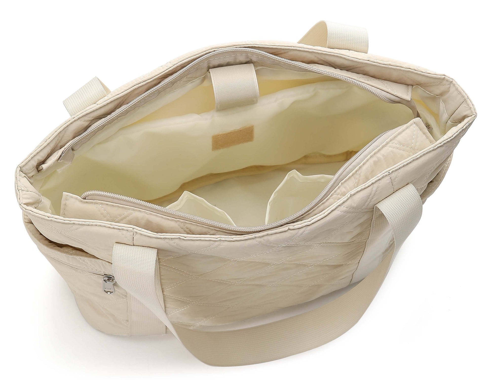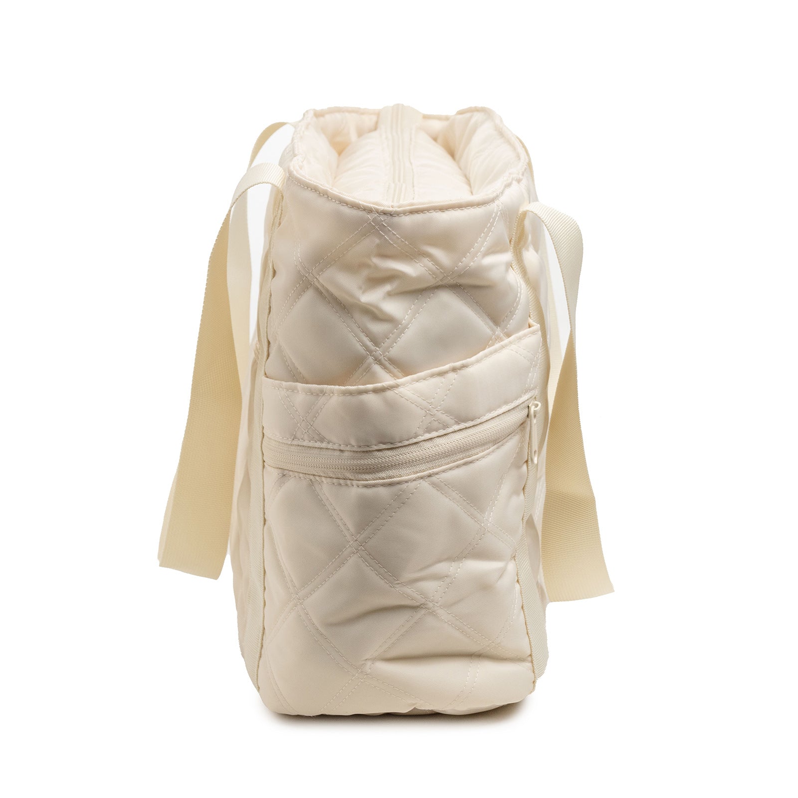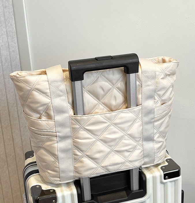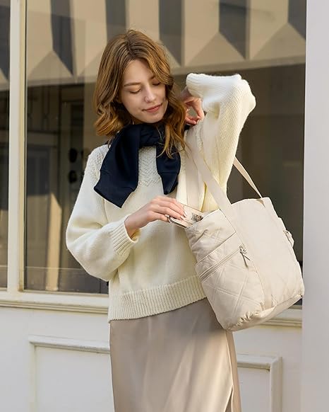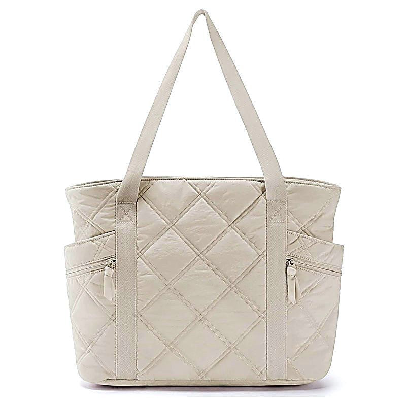 Elevate your daily routine with the Ivory Whisper Carryall — where cozy meets contemporary. Crafted from ultra-soft, pillowy nylon in a calming ivory shade, this quilted tote is designed to feel as luxurious as it looks. The elegant diamond-stitched pattern not only adds texture and charm but also ensures lightweight durability.