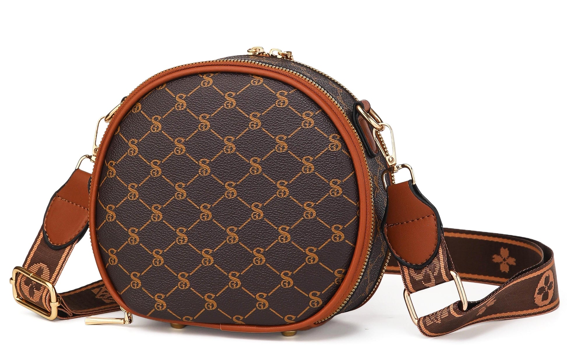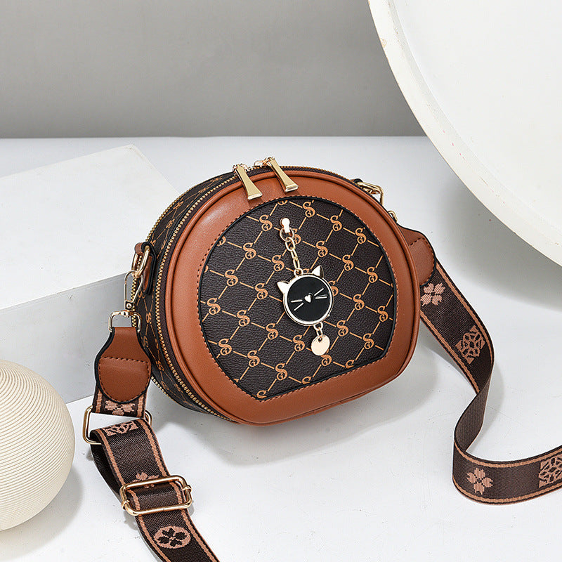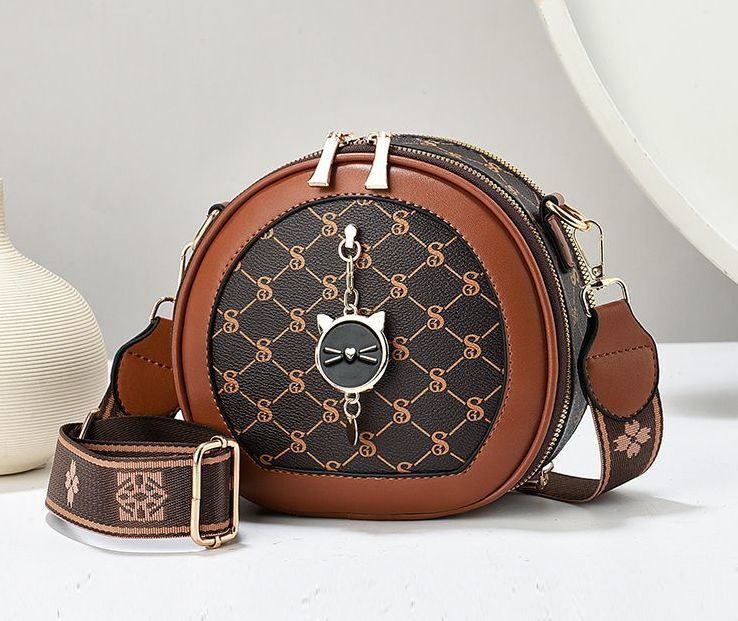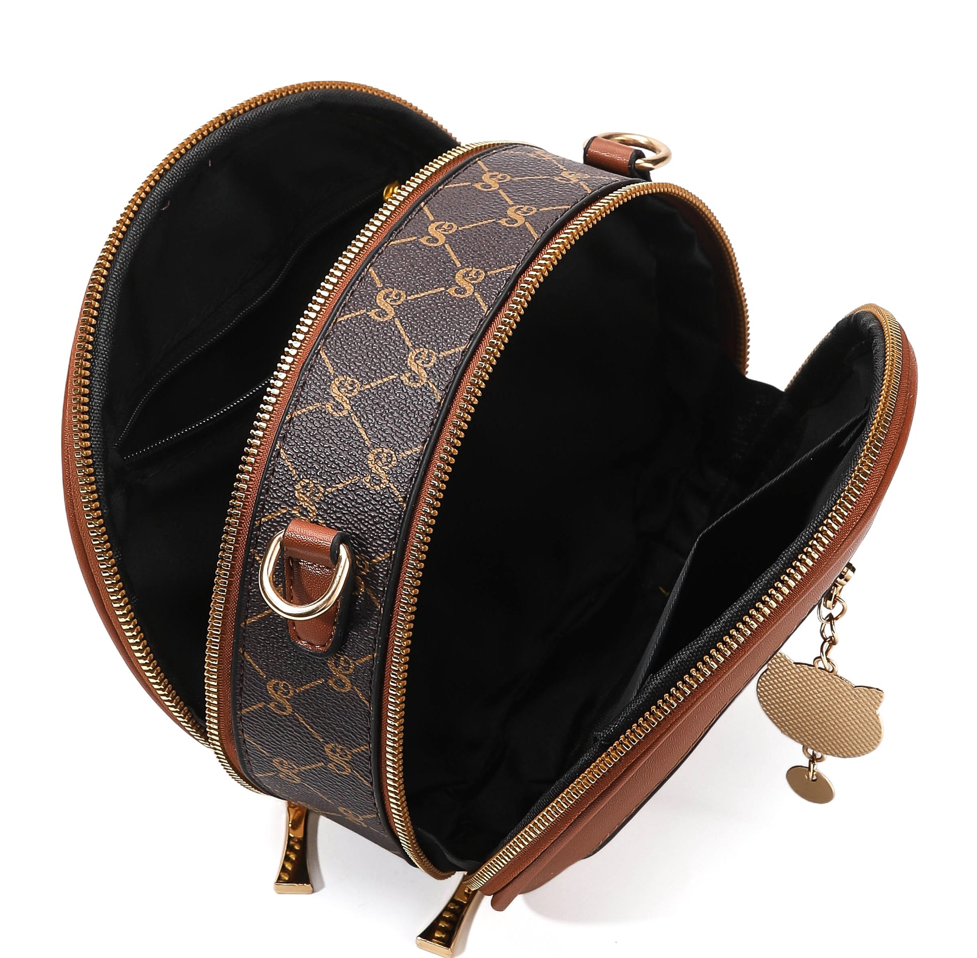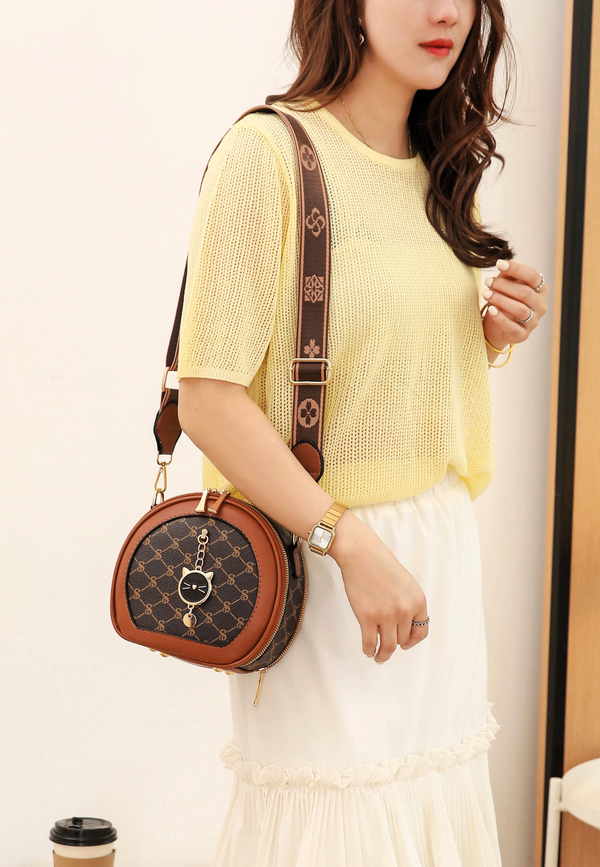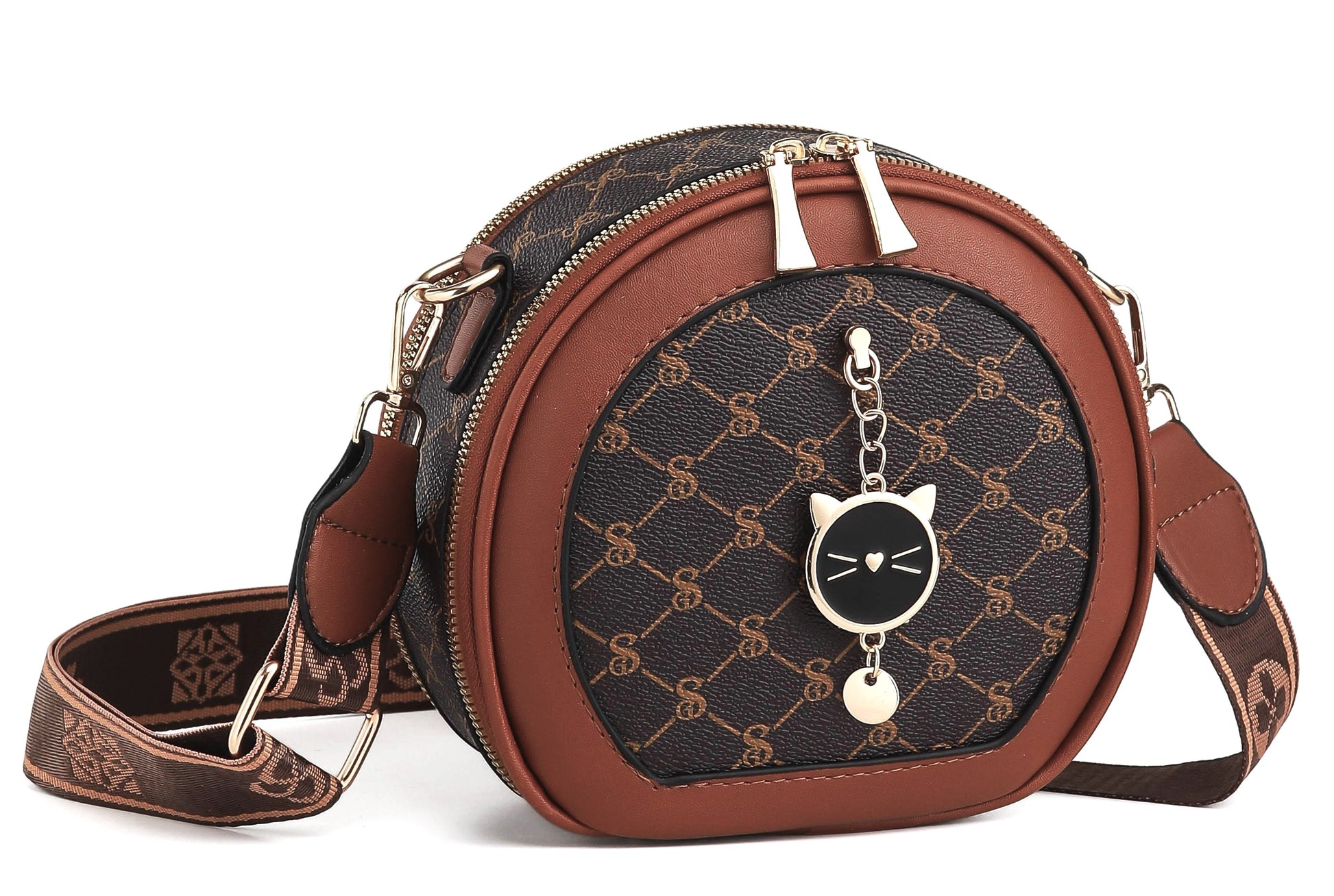 The Kitty Core Crossbody is the ultimate blend of cuteness and sophistication. Its round silhouette wrapped in a luxe brown monogram pattern gets a classy finish with solid brown trim — but the real showstopper? That adorable gold-toned cat face charm stealing the spotlight front and center.