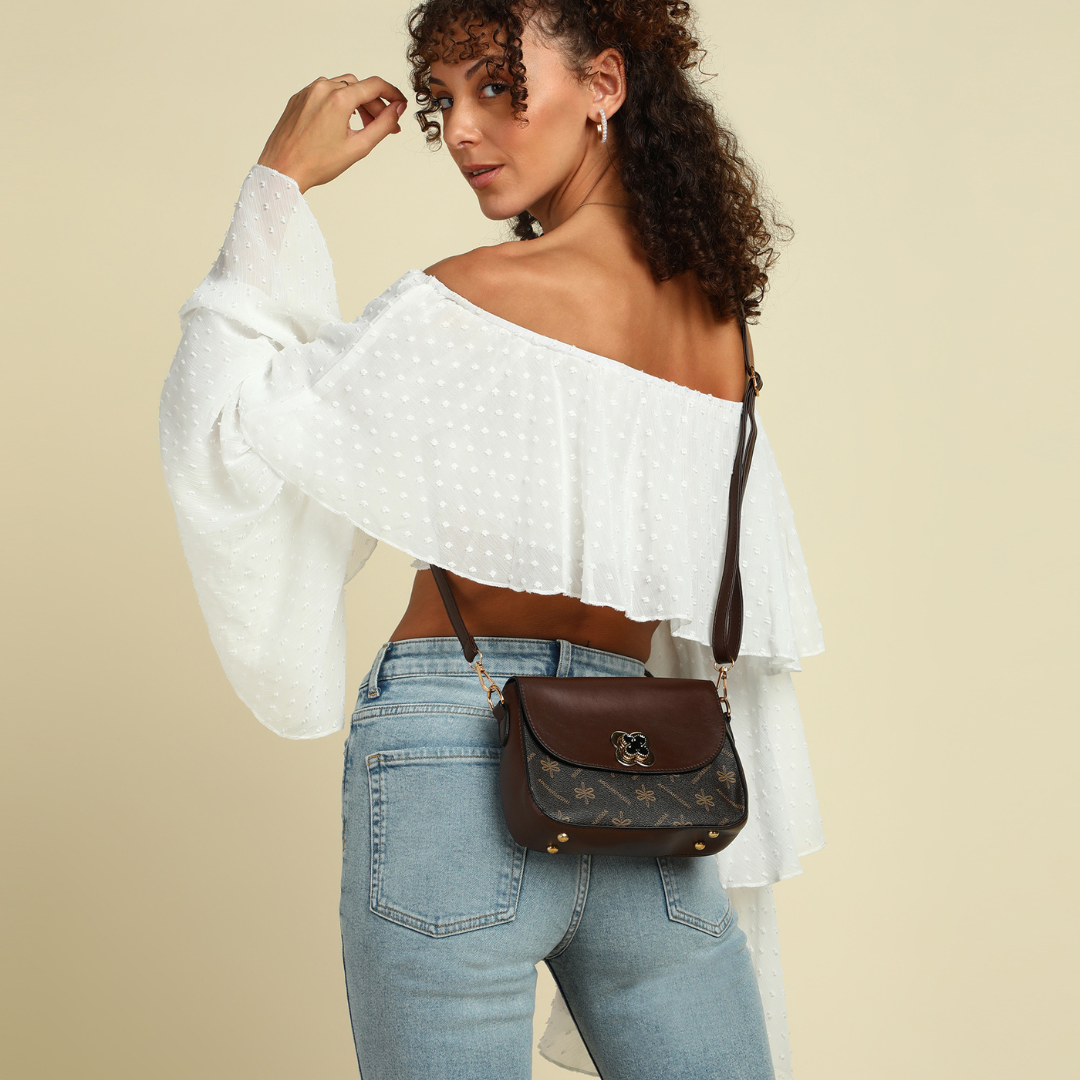 Introducing the Mocha Bloom Crossbody, a beautiful blend of elegance and everyday functionality. This stylish bag features a rich solid brown faux leather flap, opening to reveal a delicate monogrammed base that adds a layer of subtle luxury to your look.