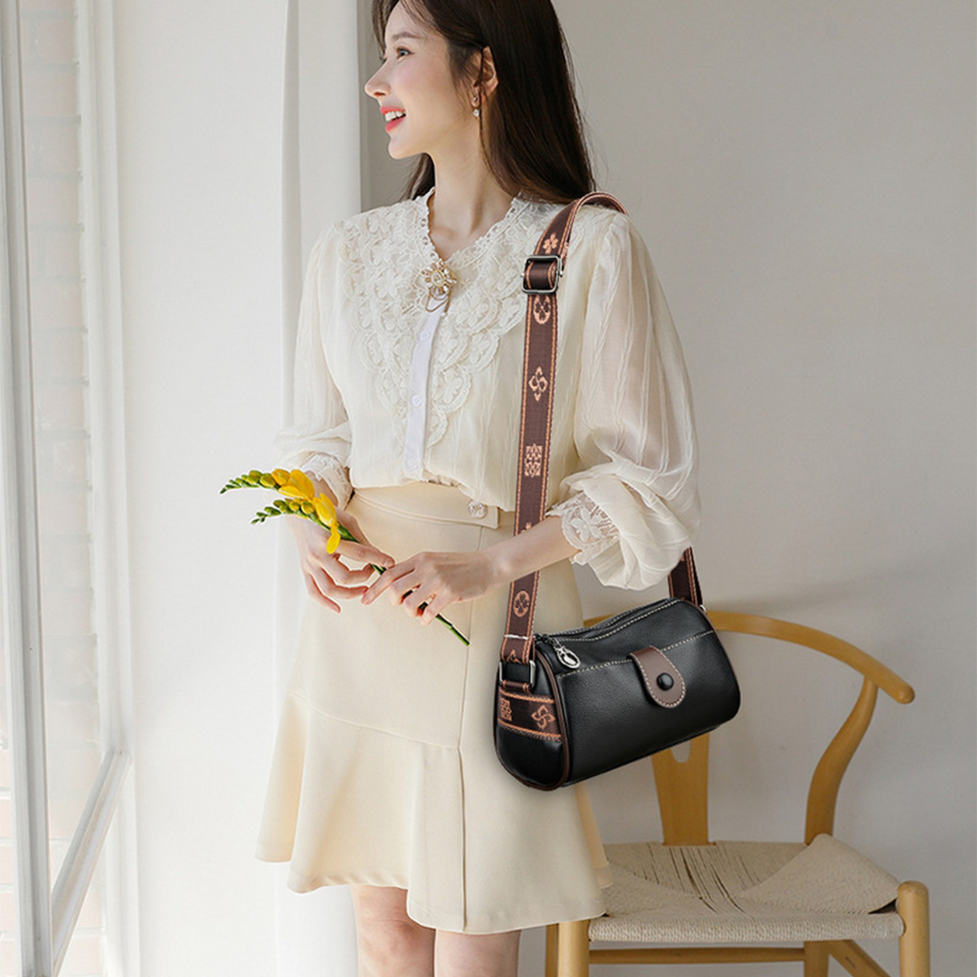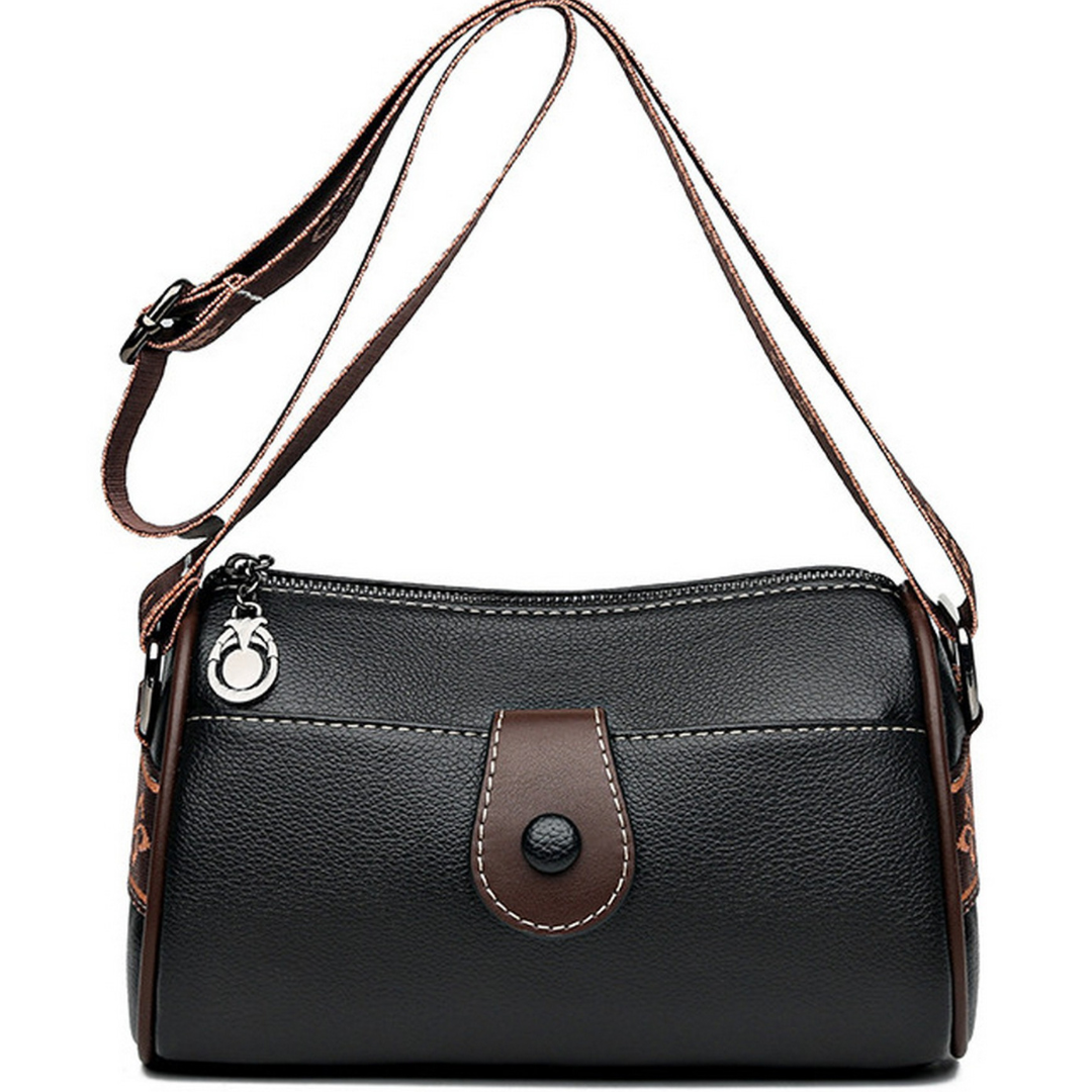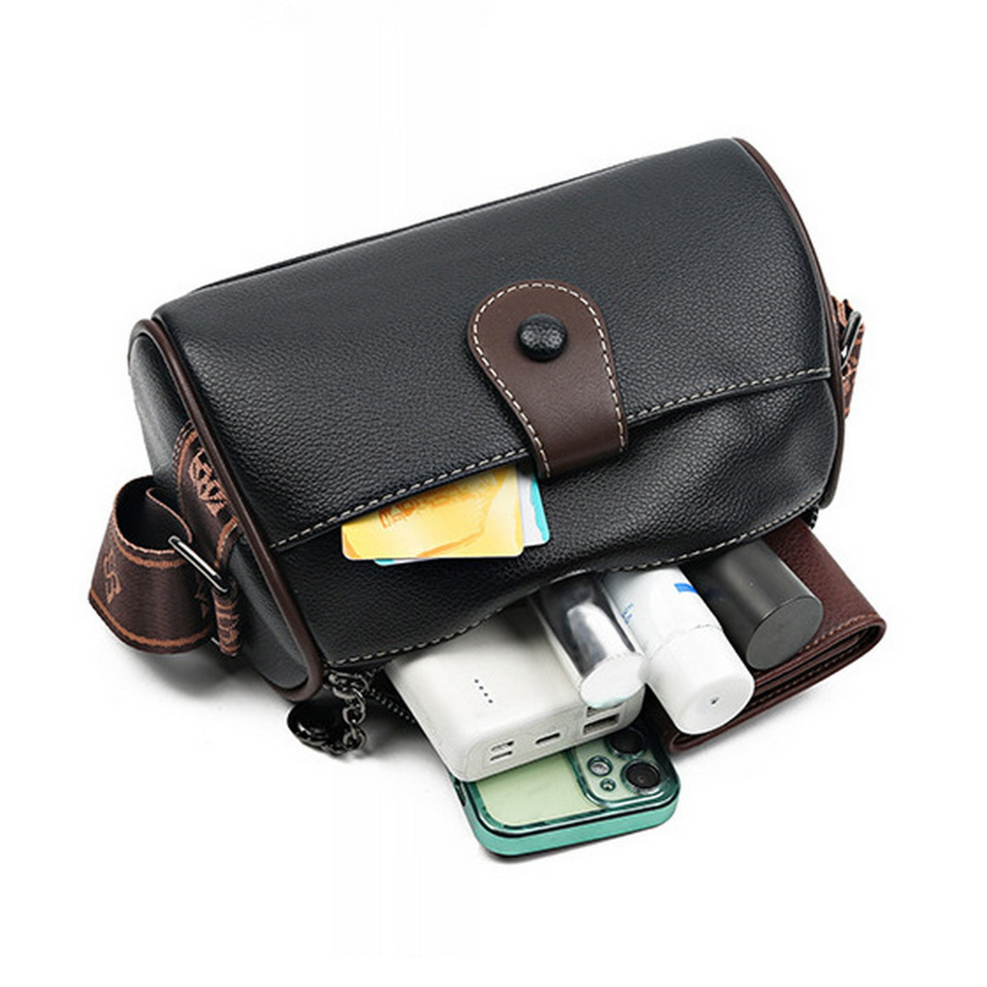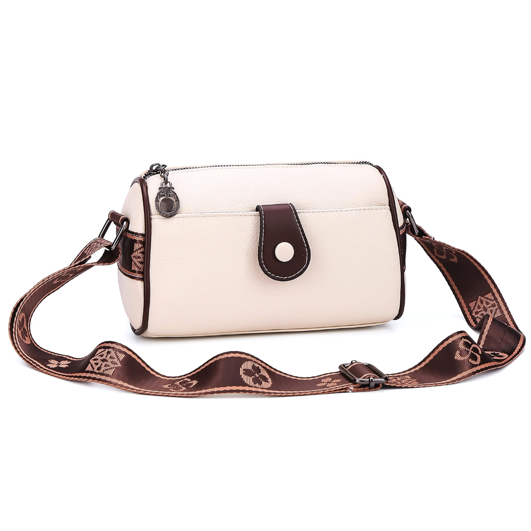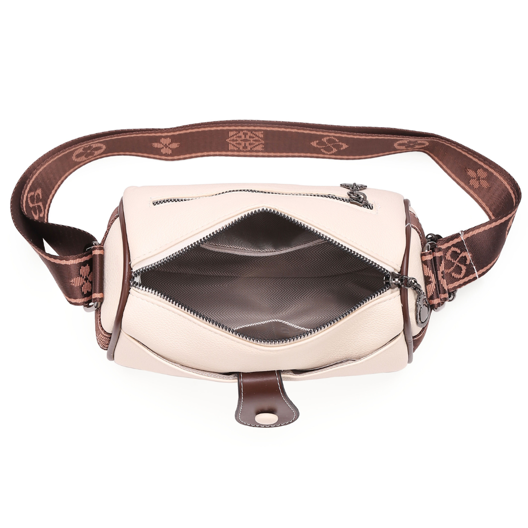 Crafted from premium faux leather, the bag is accented with contrast stitching and a bold, patterned wide shoulder strap—available in tones that complement each color variant beautifully. The structured yet compact form is ideal for on-the-go lifestyles, while the spacious interior keeps your essentials secure and organized.