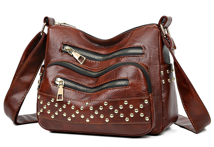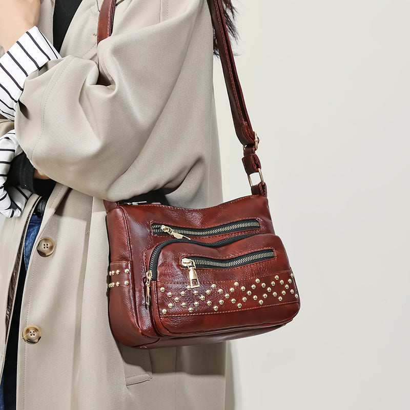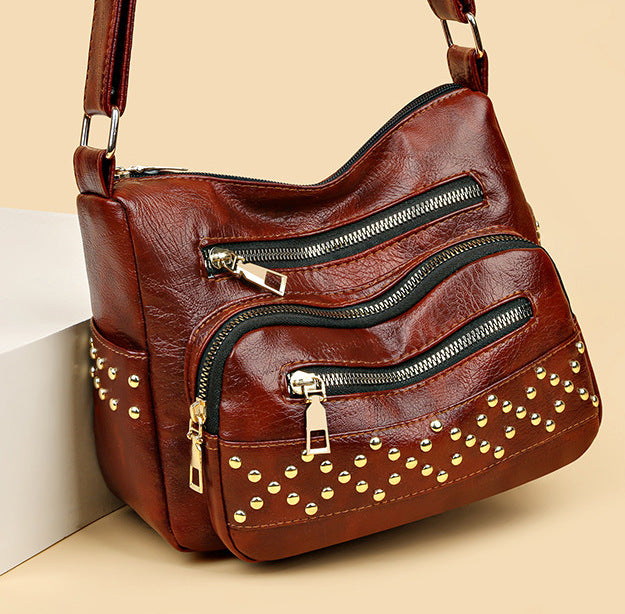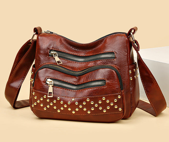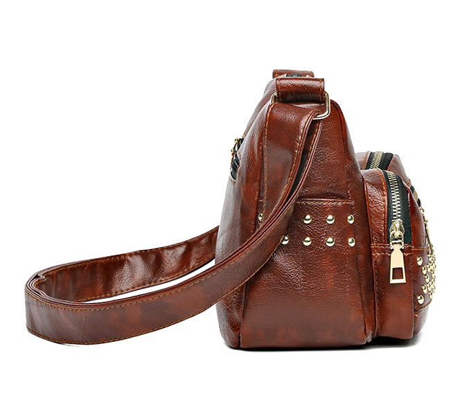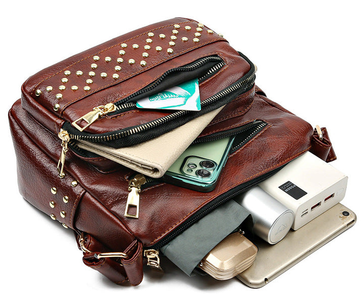 Front zip pockets give it bold personality and keep your essentials handy, while the gleaming gold-tone studs add a rebellious glam touch that turns heads wherever you go. Whether slung over your shoulder or styled crossbody, this bag is made for girls who play by their own rules.