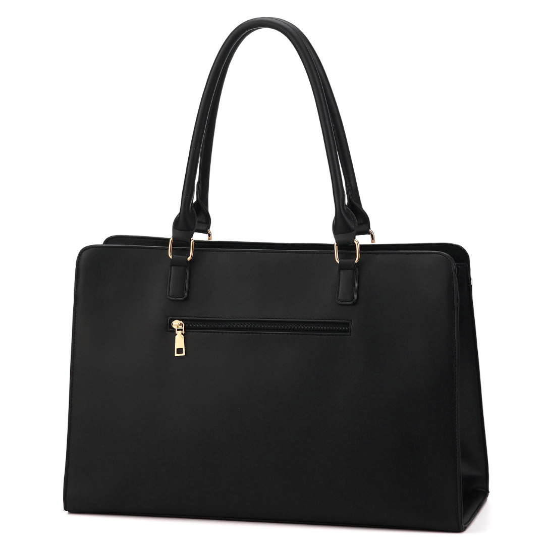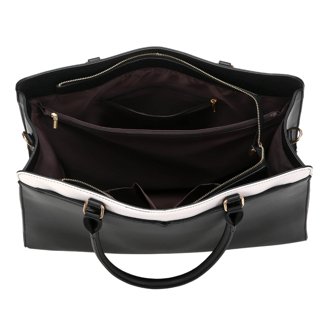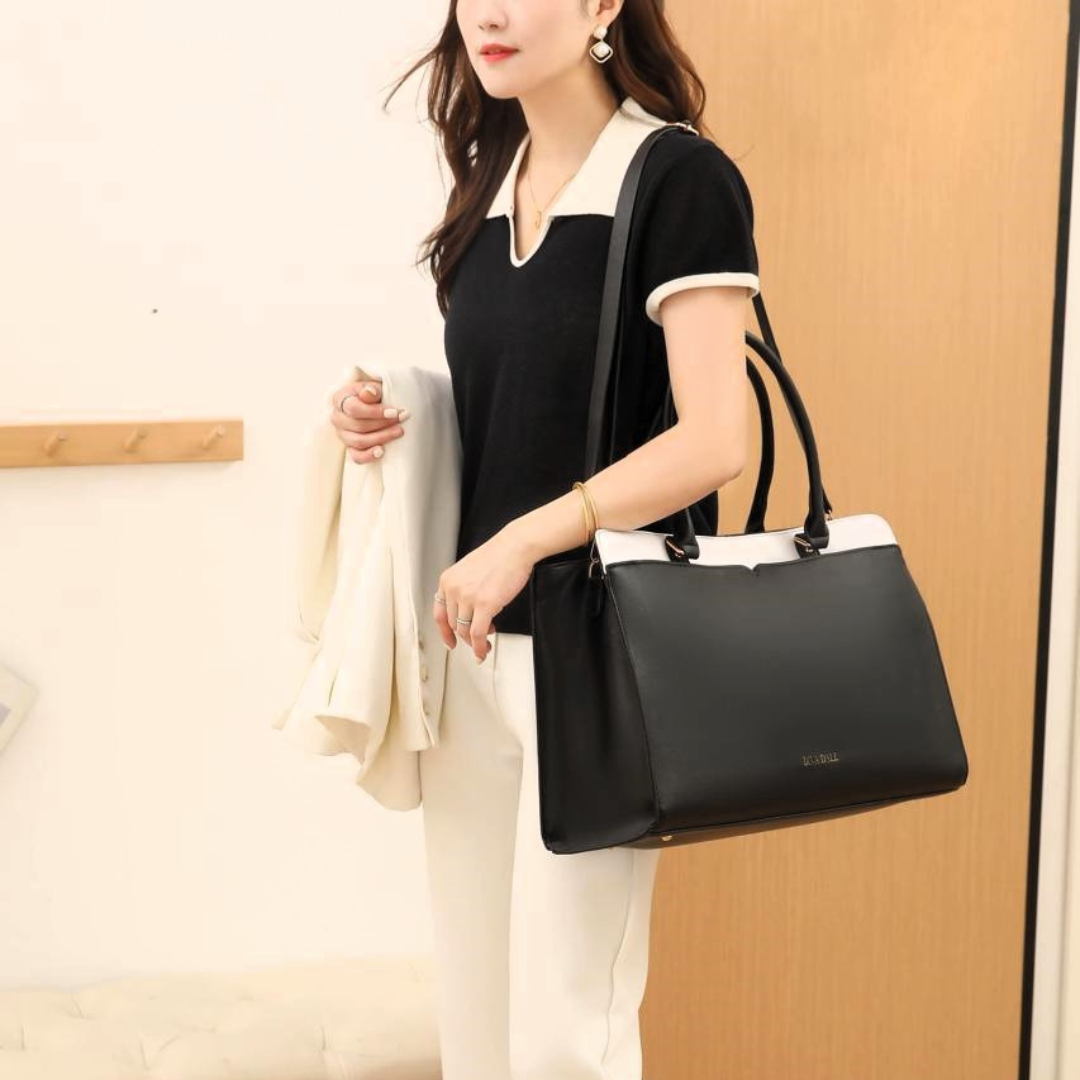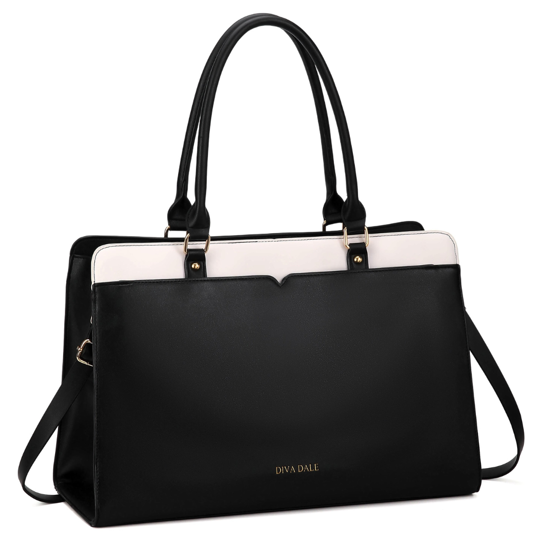 This striking laptop bag features a bold yet minimalist black-and-white color-block design, highlighted by a softly curved contrast panel and crafted from premium faux leather. The polished gold-tone hardware adds a refined finish, while structured top handles and a detachable, adjustable shoulder strap offer multiple carrying options to suit your day.