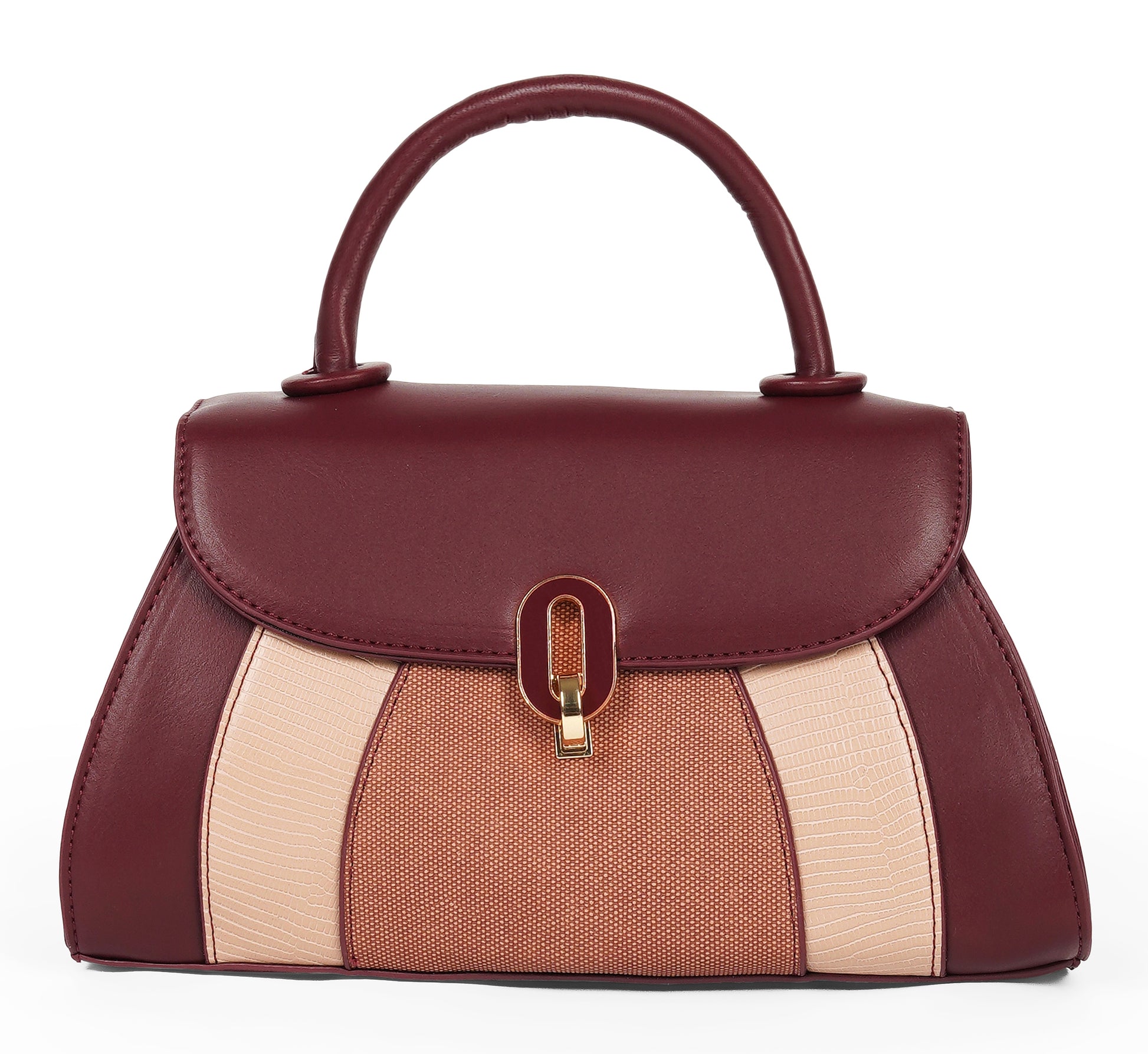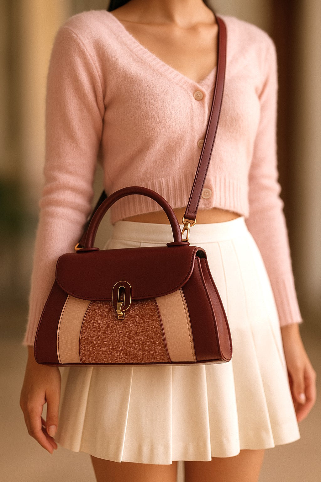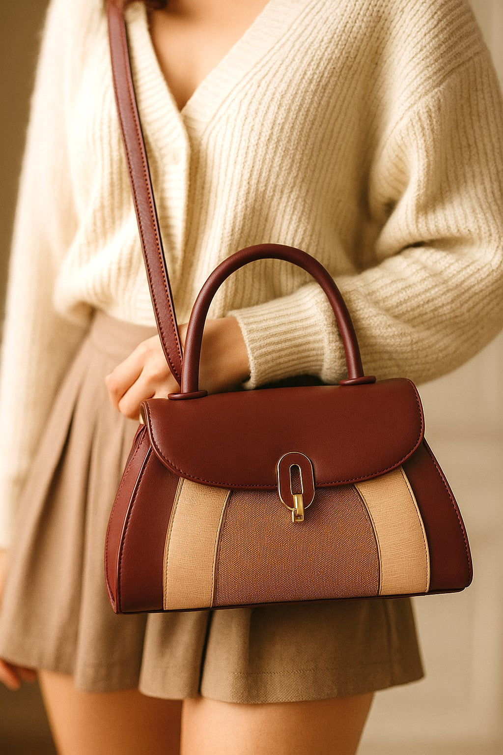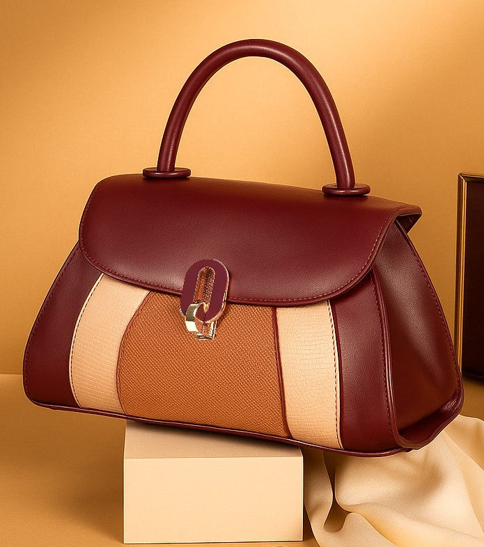 This stunning handbag is the perfect accessory to elevate any outfit with a touch of rich color and sophisticated texture. Crafted from high-quality faux leather with a woven canvas front, it features a captivating three-tone design in deep burgundy, soft beige, and a warm caramel hue. The sleek gold-tone hardware, complemented by a unique burgundy detail on the lock, and the elegant top handle give it a refined, high-fashion feel. It's the ultimate blend of classic style and modern elegance, perfect for adding a luxurious pop of color to your look.