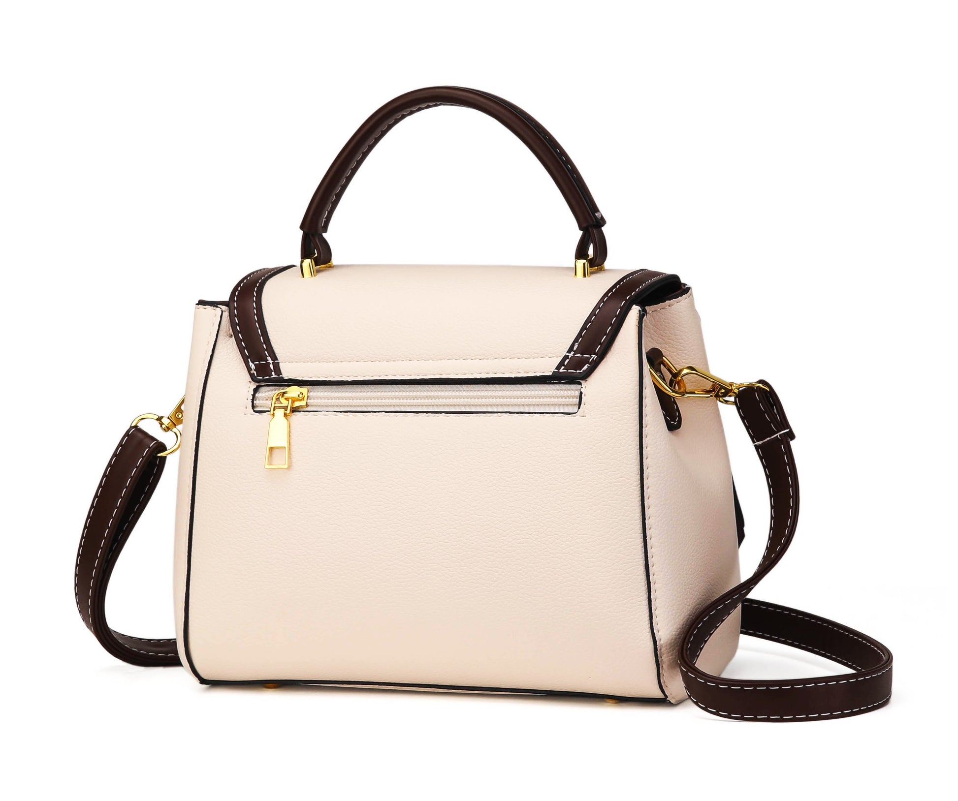 This elegant satchel effortlessly blends crisp contrast with classic, structured charm. Its box-like silhouette is crafted from smooth off-white or ivory faux leather, beautifully highlighted by rich dark chocolate brown trim that traces the edges, top handle, and the distinctive curved flap. The flap is secured by a clean, polished gold-toned bar clasp. Adding a subtle touch of modernity, the sides feature exposed vertical gold zippers that frame the design. It includes a comfortable rolled top handle and a detachable, adjustable shoulder strap, making it a timeless piece for both work and elevated weekend wear.