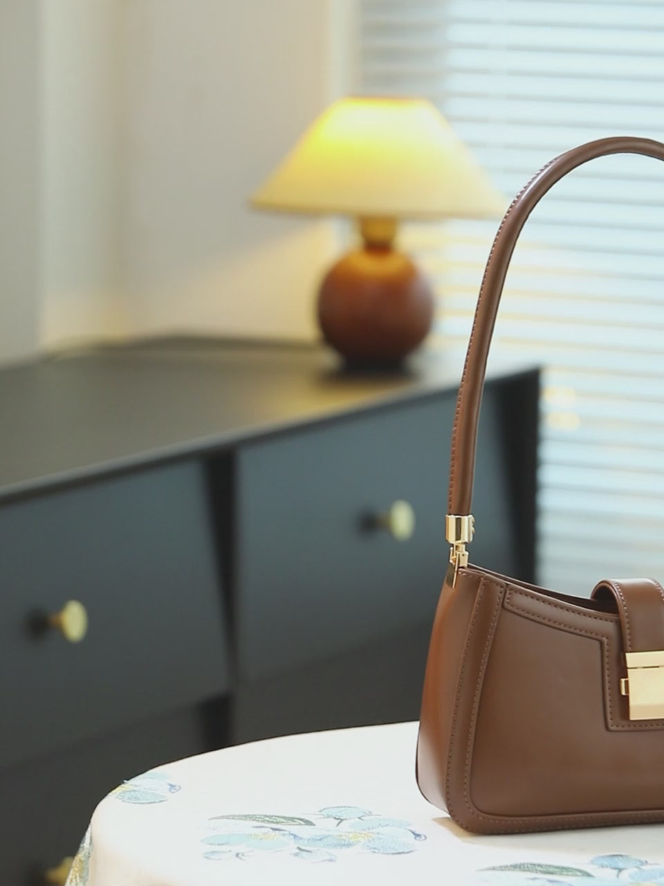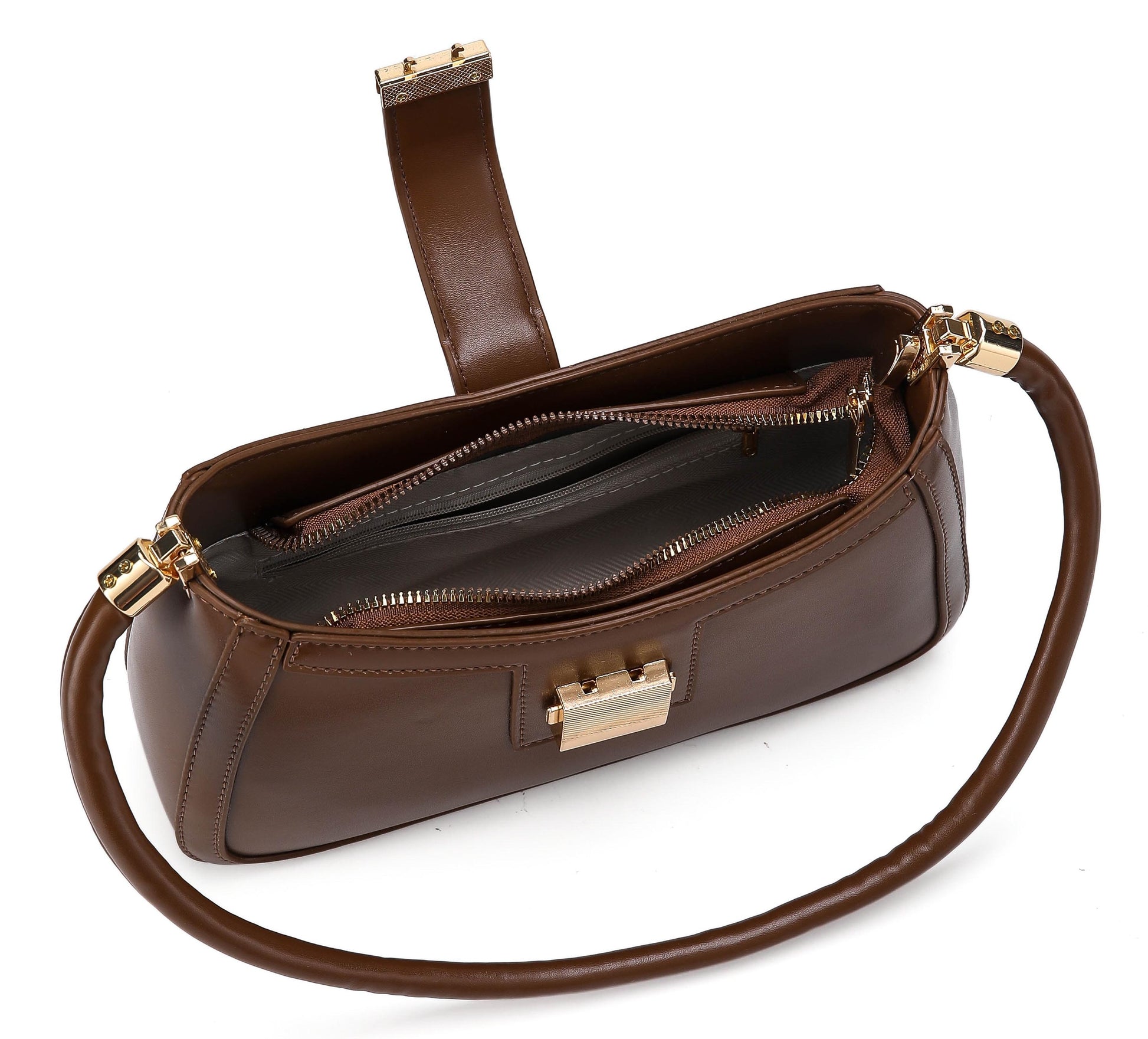 This stunning handbag is the perfect accessory to elevate any outfit with a touch of timeless elegance and sophisticated design. Crafted from high-quality, smooth faux leather in a warm brown, it features a sleek crescent-shaped silhouette. The front is secured by a clean, geometric gold-tone clasp that adds a hint of refined detail. Complemented by a comfortable, adjustable shoulder strap, it exudes a polished, high-fashion feel. It's the ultimate blend of classic charm and chic functionality, perfect for adding a refined and graceful touch to your look.