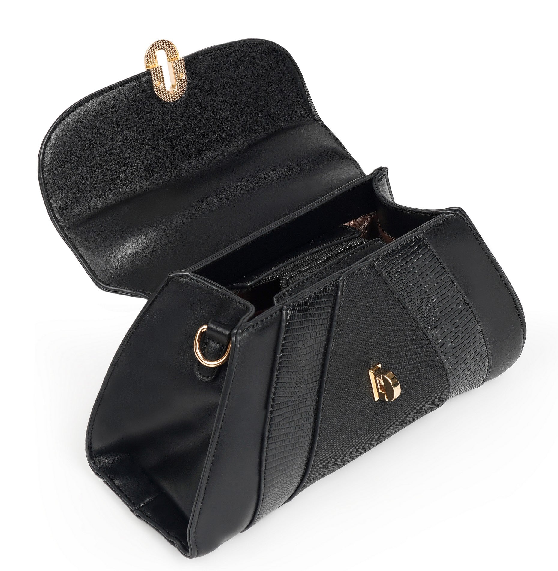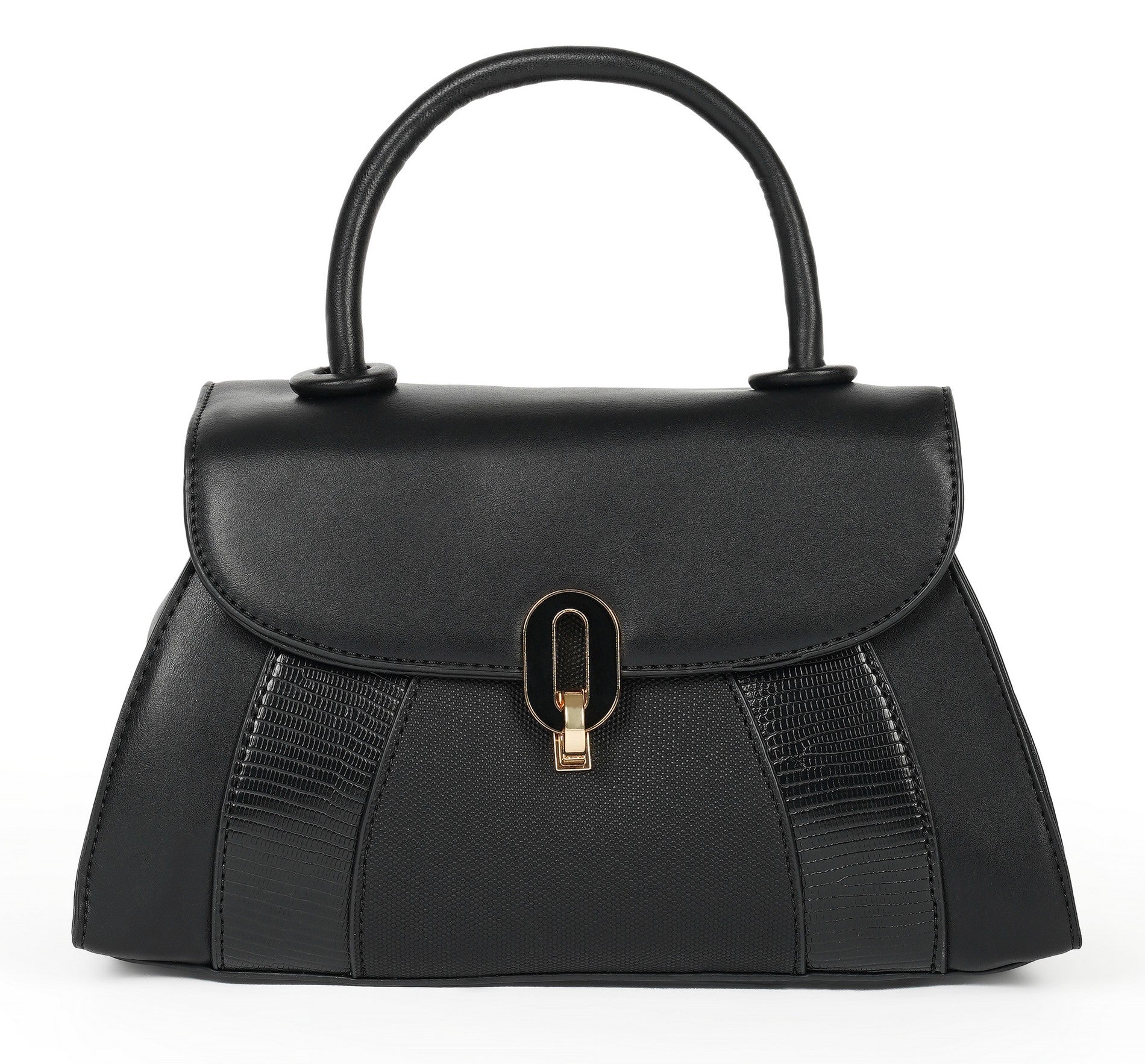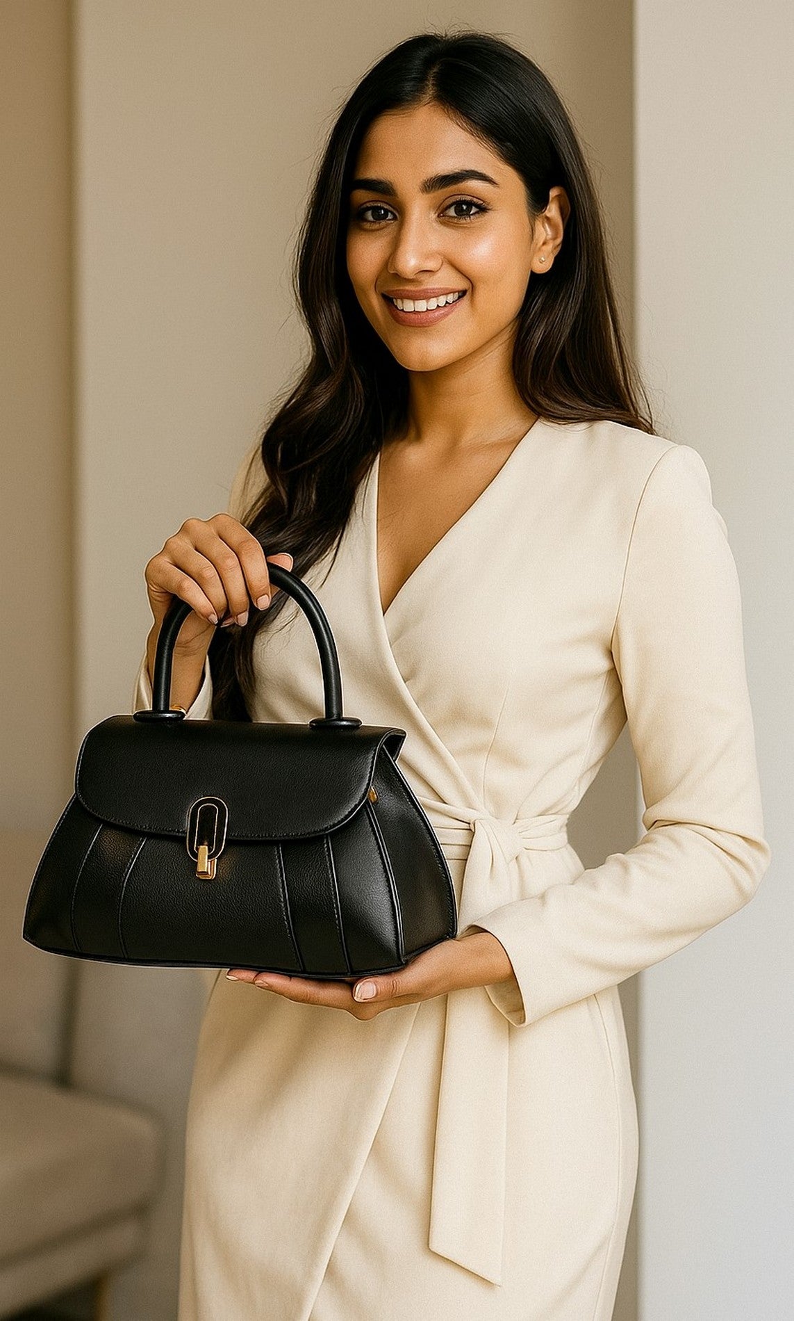 This elegant handbag elevates any ensemble with enduring sophistication. Made from premium faux leather, it showcases a distinctive structured shape complemented by delicate ribbed accents on the sides, imparting subtle luxury. Sleek gold hardware and a graceful top handle enhance its polished, fashion-forward appeal. It perfectly merges timeless style with contemporary refinement.