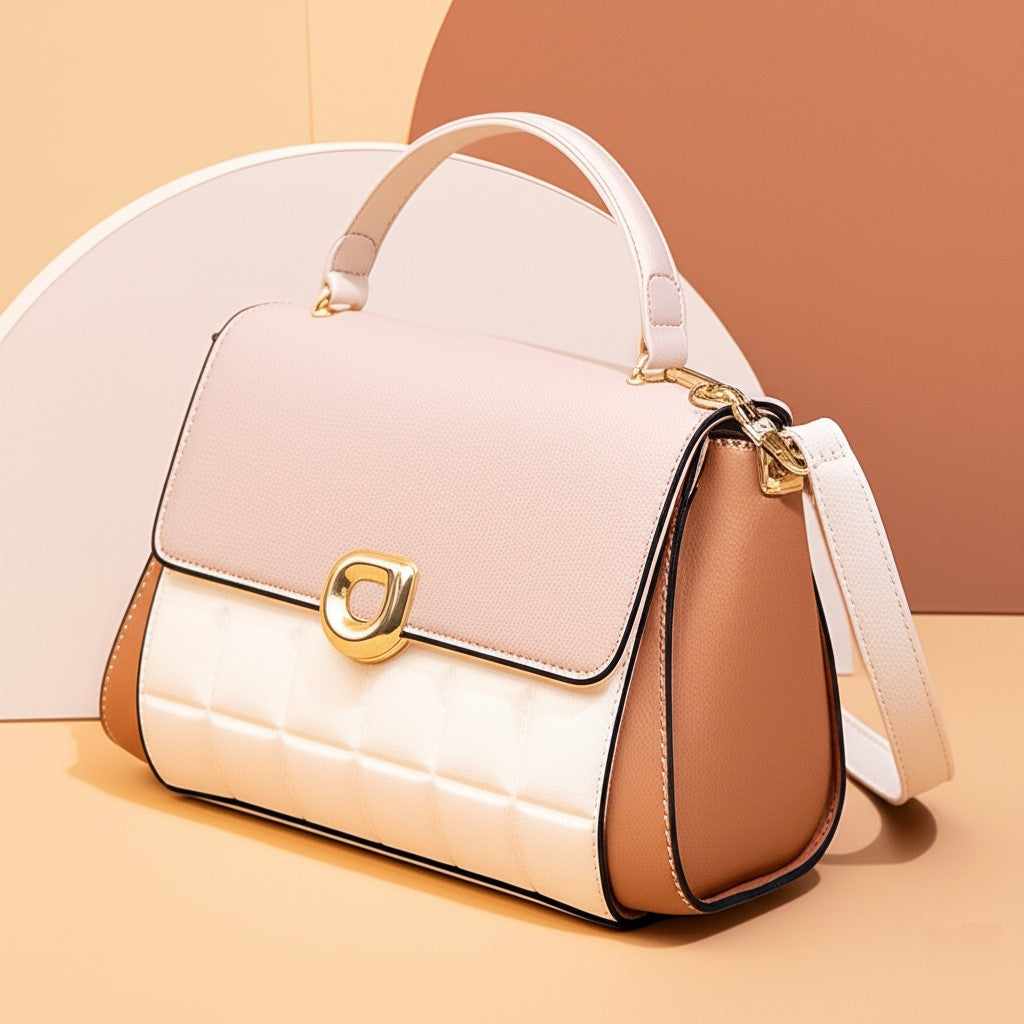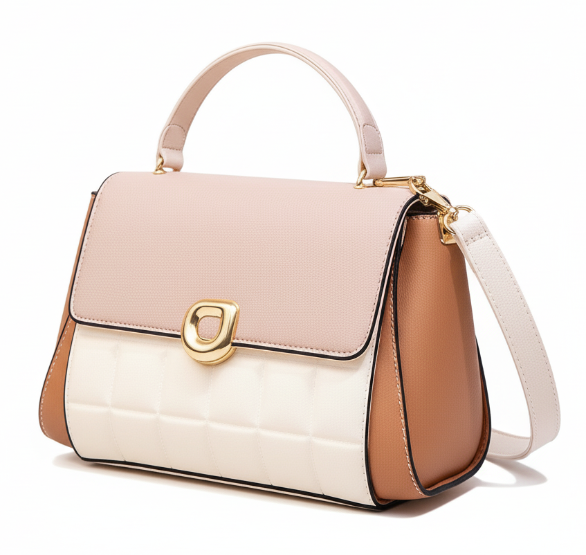This stunning handbag is the perfect accessory to elevate any outfit with a touch of soft elegance and modern design. Crafted from high-quality faux leather, it features a captivating three-tone design combining delicate blush pink, creamy off-white, and warm caramel. The front showcases a subtle quilted texture on the off-white panel, adding a touch of sophisticated detail. Complemented by sleek gold-tone hardware and an elegant top handle, it exudes a refined, high-fashion feel. It's the ultimate blend of soft femininity and chic functionality, perfect for adding a graceful touch to your look.