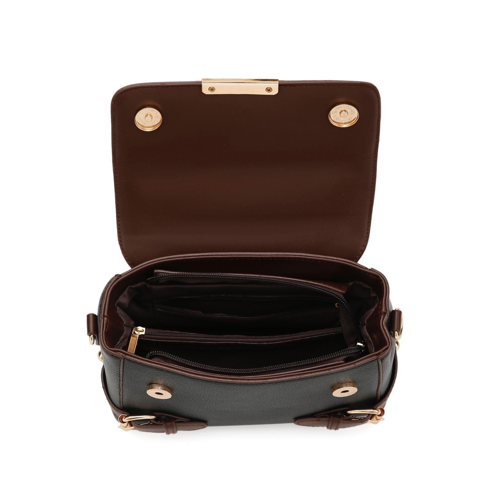 This structured satchel is a sleek blend of classic design and heritage-inspired details, perfect for a polished, everyday look. The structured, boxy silhouette is crafted from a black pebbled faux leather body, creating a sophisticated base. The bag is elegantly trimmed in smooth rich brown faux leather on the top handle, the stylized flap border, and the twin decorative buckle straps on the front. A clean gold-toned bar clasp secures the flap, while the two faux buckle straps with gold hardware add a traditional, distinguished feel. It includes a comfortable top handle and a detachable, adjustable shoulder strap for versatile wear.