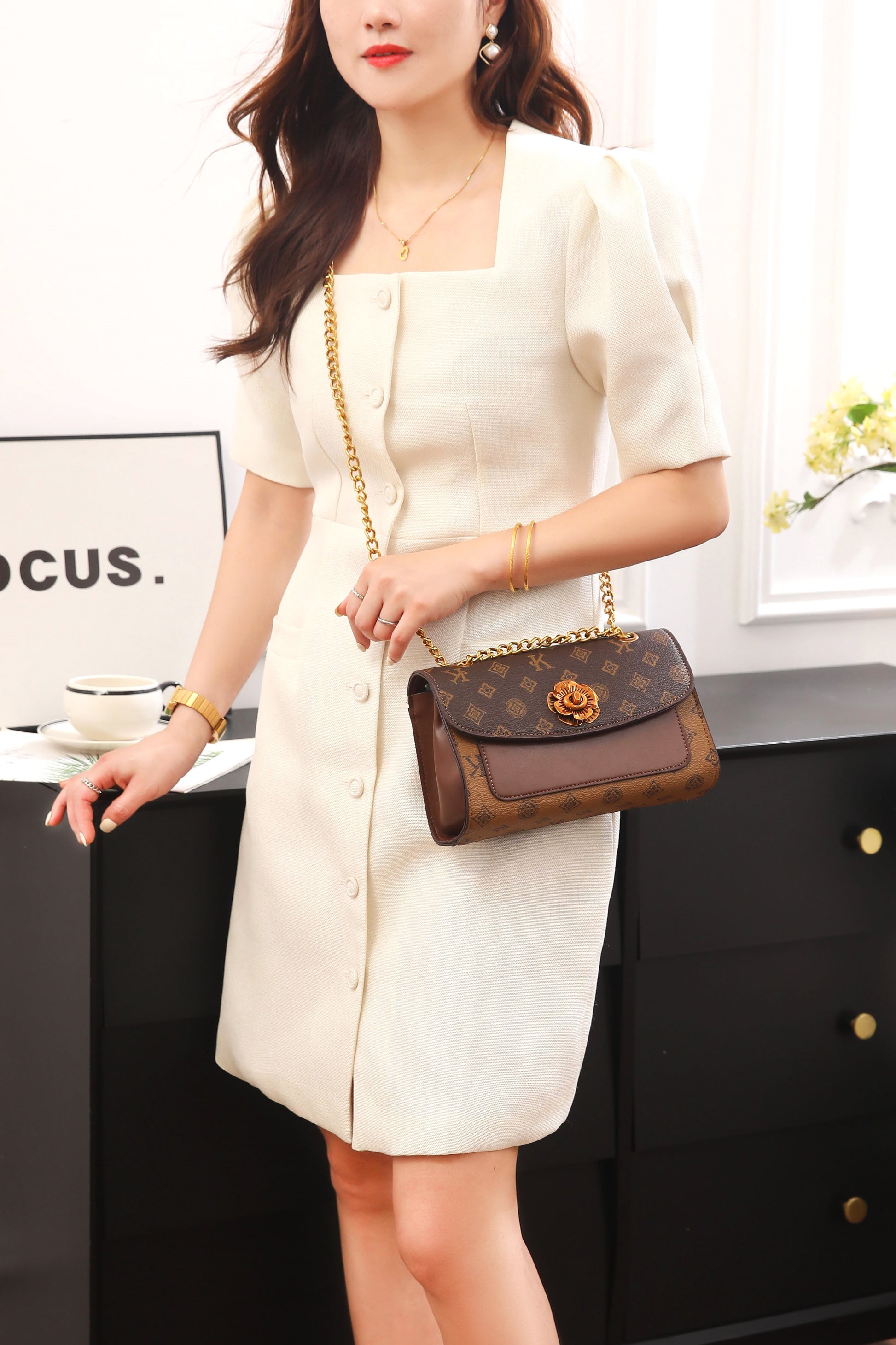 This is a statement piece for the person who loves a classic, elevated look with a unique twist. This flap bag features a sophisticated monogram-style pattern in rich brown and tan tones on the flap and front panel, creating a high-fashion, designer-inspired feel. The sleek, solid brown faux leather on the base and sides provides a polished contrast. The standout feature is the striking gold floral emblem at the center of the flap, which serves as both the clasp and a beautiful focal point. It's a perfect blend of timeless elegance and modern flair. The bag is finished with a bold, gold-toned chain strap that adds a touch of glamour and can be worn in multiple ways.