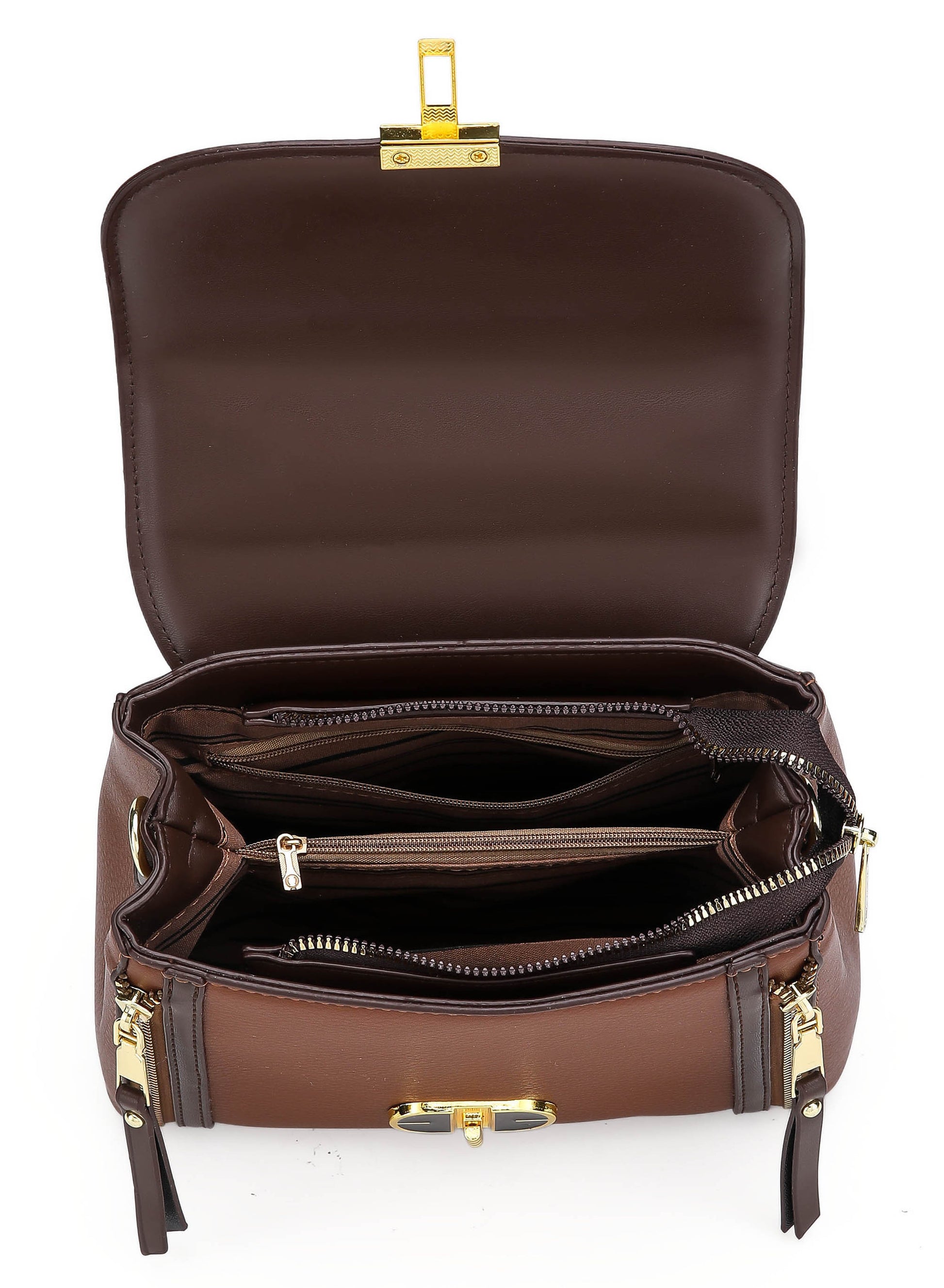 This stunning handbag is the perfect accessory to elevate any outfit with a touch of classic sophistication and modern design. Crafted from high-quality faux leather, it features a striking two-tone design that combines a sleek black body with rich brown trim. The front is secured by a bold, gold-tone 'T' shaped clasp, and the sides feature stylish exposed zippers with tasseled pulls. Complemented by a sturdy top handle and a detachable, adjustable strap, it exudes a refined, high-fashion feel. It's the ultimate blend of timeless elegance and chic functionality, perfect for a polished look.